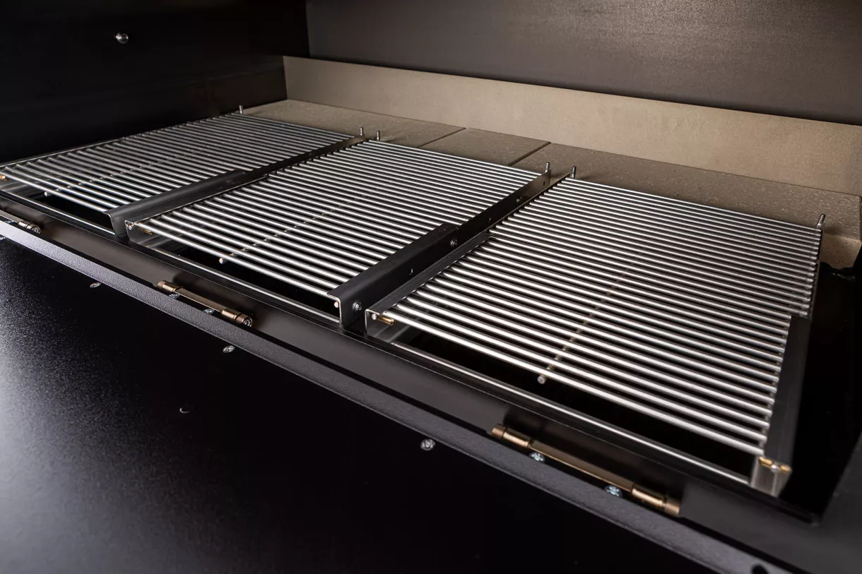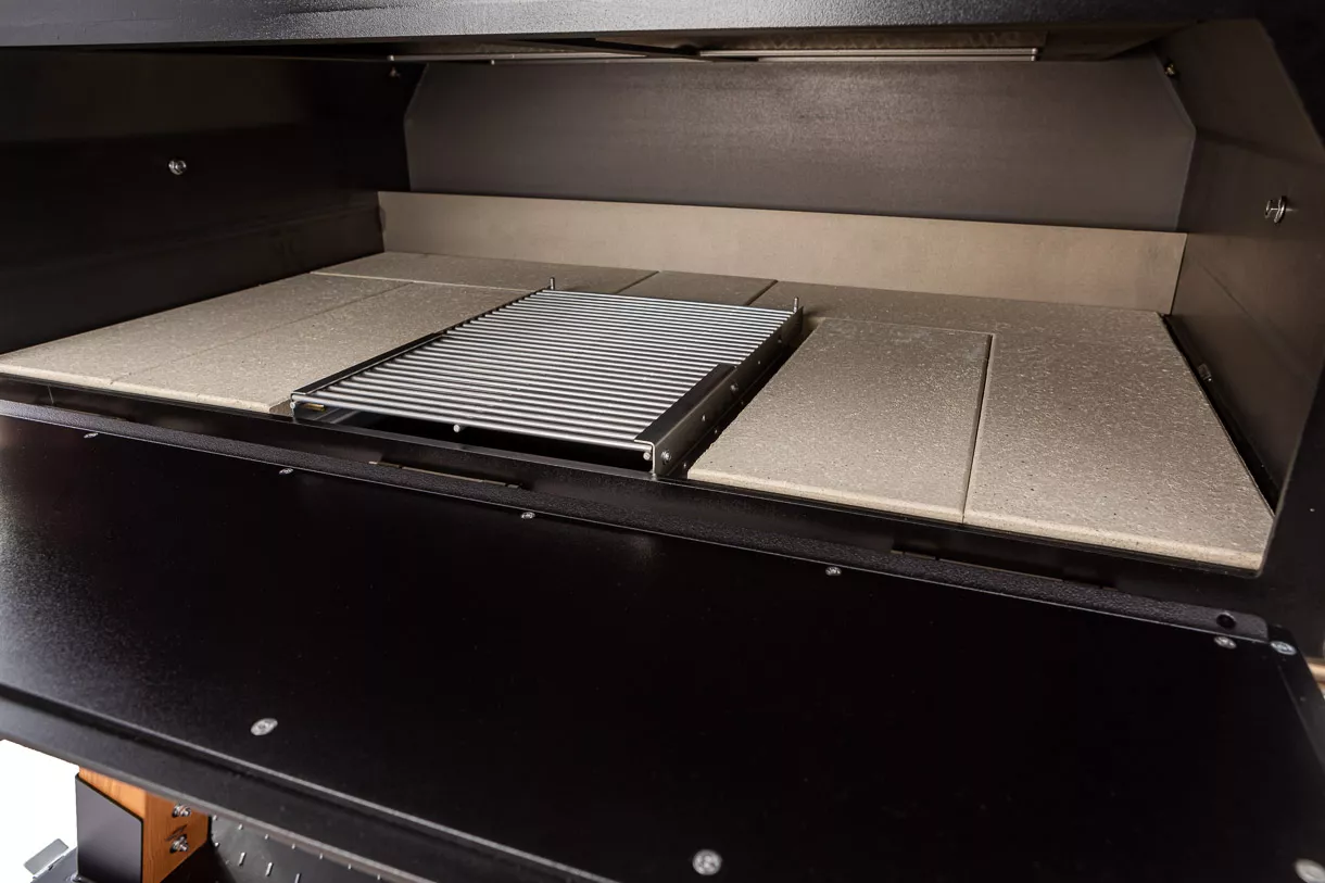Die Ausstattung umfasst 9 Naturschamottsteine und ein ausziehbares Grillrost. Optional sind zwei weitere ausziehbare Grillroste erhältlich. Die Naturschamottsteine sind 4,5 cm dick und schadstofffrei, lokal produziert und am unteren Boden gerillt, um die Hitze gleichmäßiger zu verteilen.