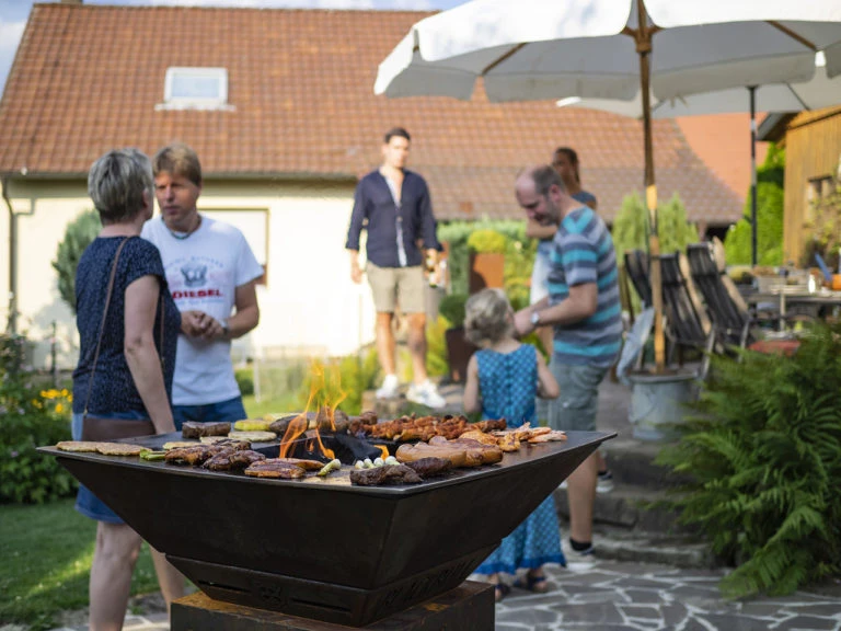 Sie können bereits nach ca. 20 Minuten mit dem Grillen starten. Sobald sich die Platte erhitzt entsteht eine Neigung nach innen, sodass überschüssiges Öl/Fett nicht über den Rand nach außen tropft. Durch die quadratische Form der Grillplatte entstehen unterschiedliche Temperaturbereiche, die ein Anbraten bei hoher Hitze am inneren Rand aber auch ein warmhalten bei geringer Hitze in den Eckbereichen ermöglichen. Da das Feuer nicht direkt auf das Grillgut gelangt, sondern durch die Platte getrennt ist, entstehen keine gesundheitsschädigenden Stoffe. Die Reinigung der Grillplatte ist einfach und unmittelbar erledigt – umstandslos lassen sich mit dem Spachtel sämtliche überschüssigen Grillreste in das Feuer schieben und anschließend die saubere Grillplatte mit Öl und einem Küchentuch reinigen und einölen. Die übrige Asche kann mühelos über das zweiteilige Ascheblech in die Ascheschublade gekehrt werden.