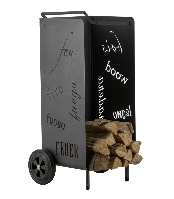 Kaminholzregal aus Stahl in graphitgrau – Schriftzüge „Holz“ und „Feuer“
