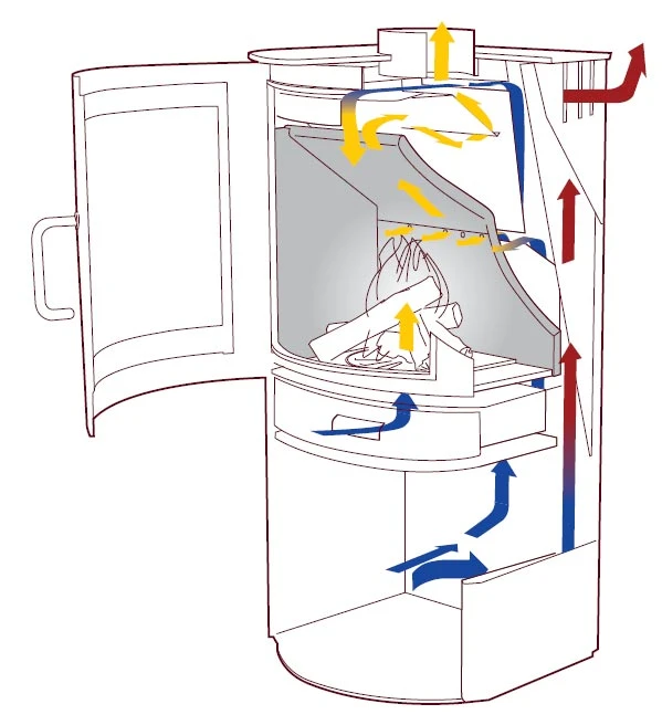 Das Zweikammer-Brennsystem arbeitet außergewöhnlich leistungsstark bei der Wärmeerzeugung. Es wärmt die Verbrennungsluft vor, bevor sie in den Feuerraum eingeleitet wird und verhindert so Energieverluste.